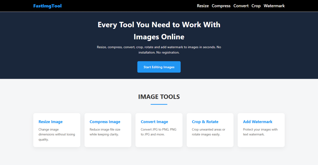 FastImgTool is a fully functional image processing web application that enables users to resize, compress,